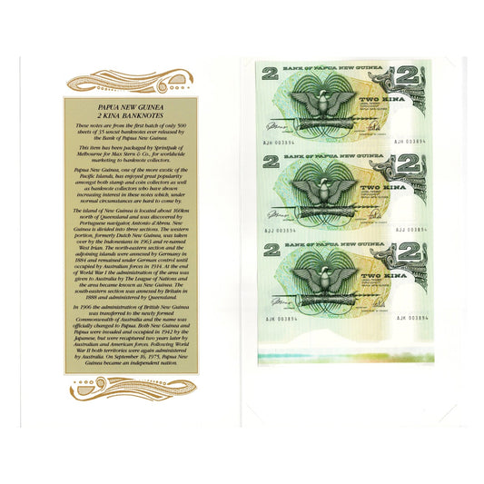 1975 Papua New Guinea - 2 Kina - Strip of 3 Uncut Paper Banknotes in Folder