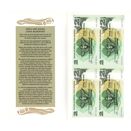 1975 Papua New Guinea - 2 Kina - Block of 4 Uncut Banknotes in Folder