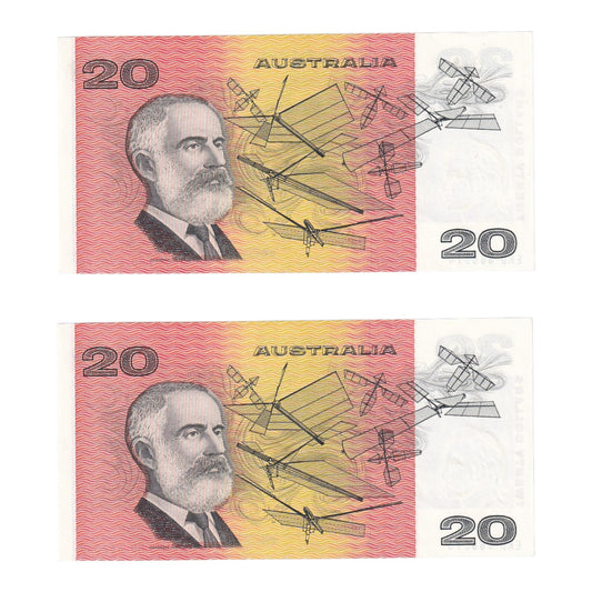 1985 $20 Note Pair - Sequential Numbers - EKD 868514 & EKD 868515 - Johnston/Fraser - Gothic Serial - R409b - About Uncirculated