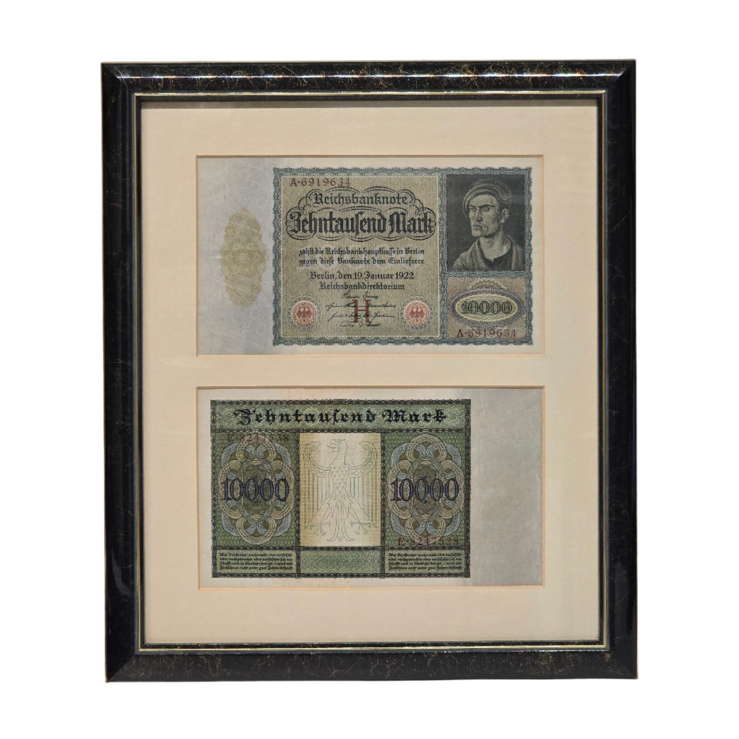 - 1922 10000 Mark (Germany p70): Issued on 19.1.1922, this 10000 Mark note is printed in blue-green on an olive-green under print. A male portrait by Albrecht Durer (similar to p71) is featured at the right, and the back showcases an eagle in a rectangular ornament. This note illustrates the rapid devaluation of currency during the hyperinflation period.