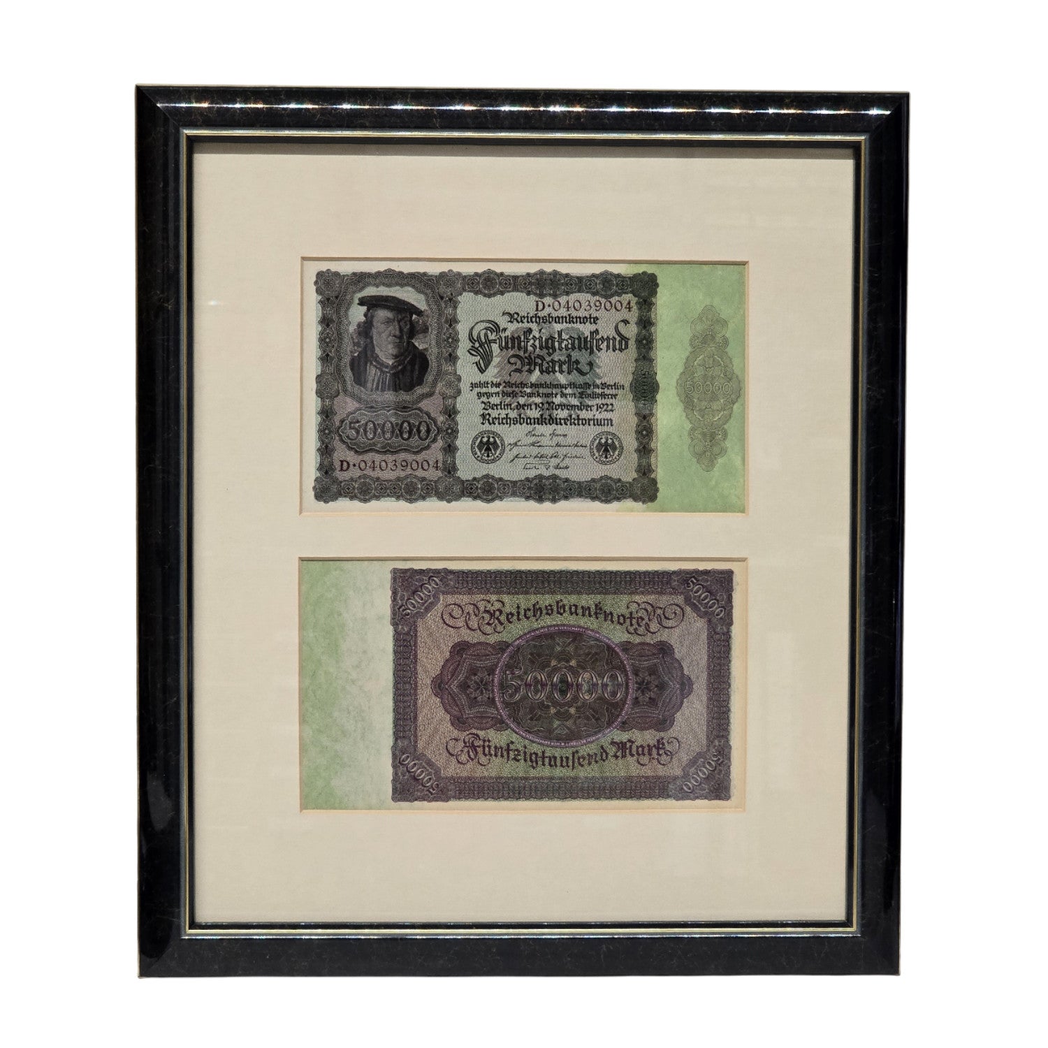 1922 50000 Mark: This stunning example of the soaring figures that characterised the hyperinflation crisis is represented by two notes, showing both the front and back: