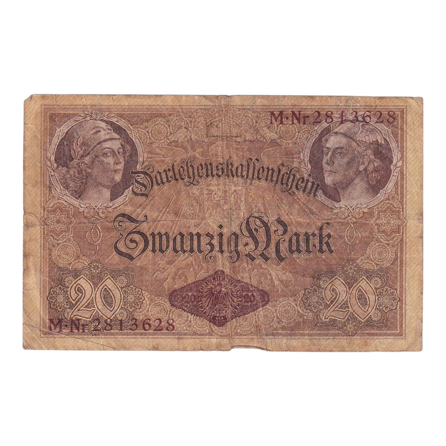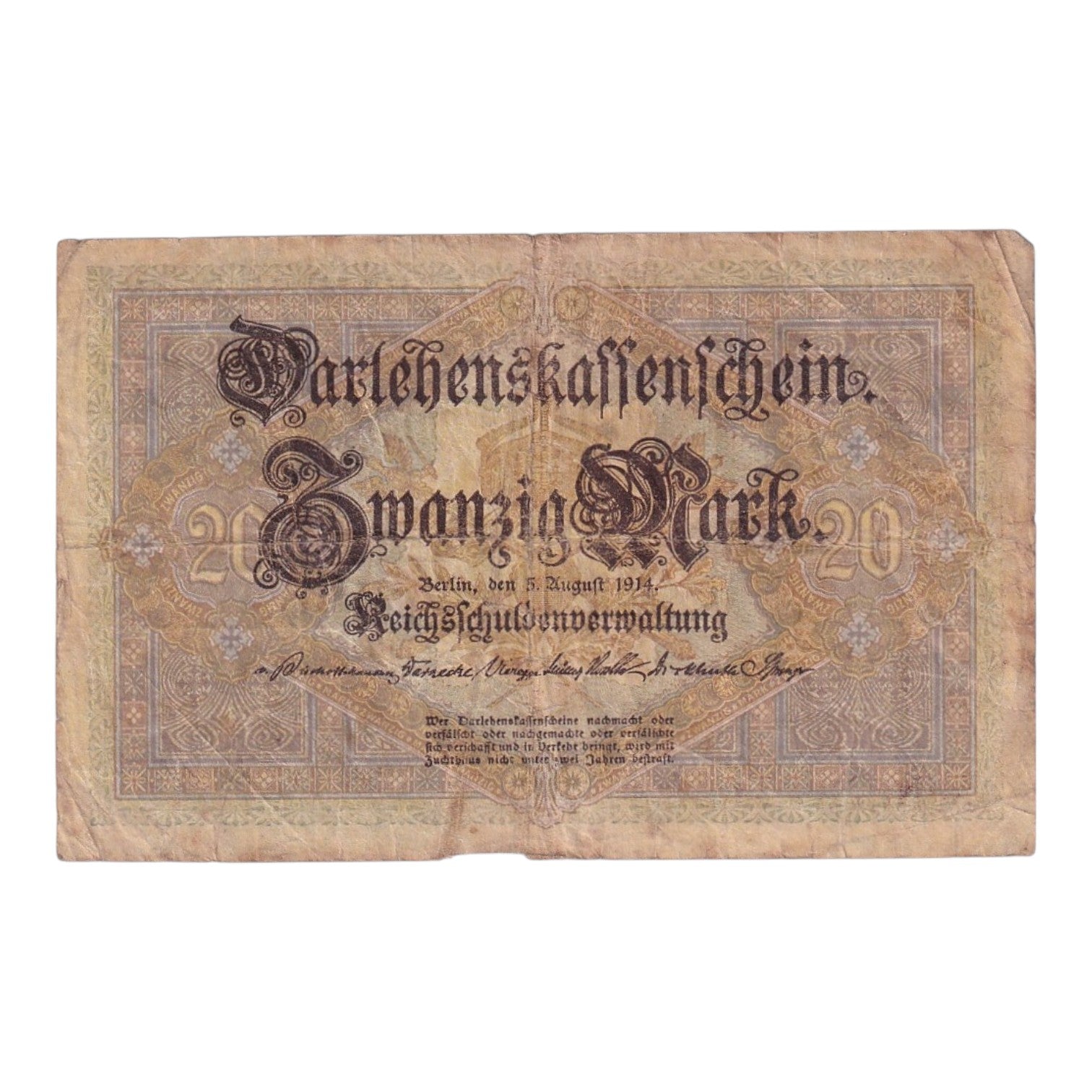 This 1914 German 20 Mark banknote is a fascinating piece of currency from the beginning of the First World War, reflecting the allegorical art style of the era.