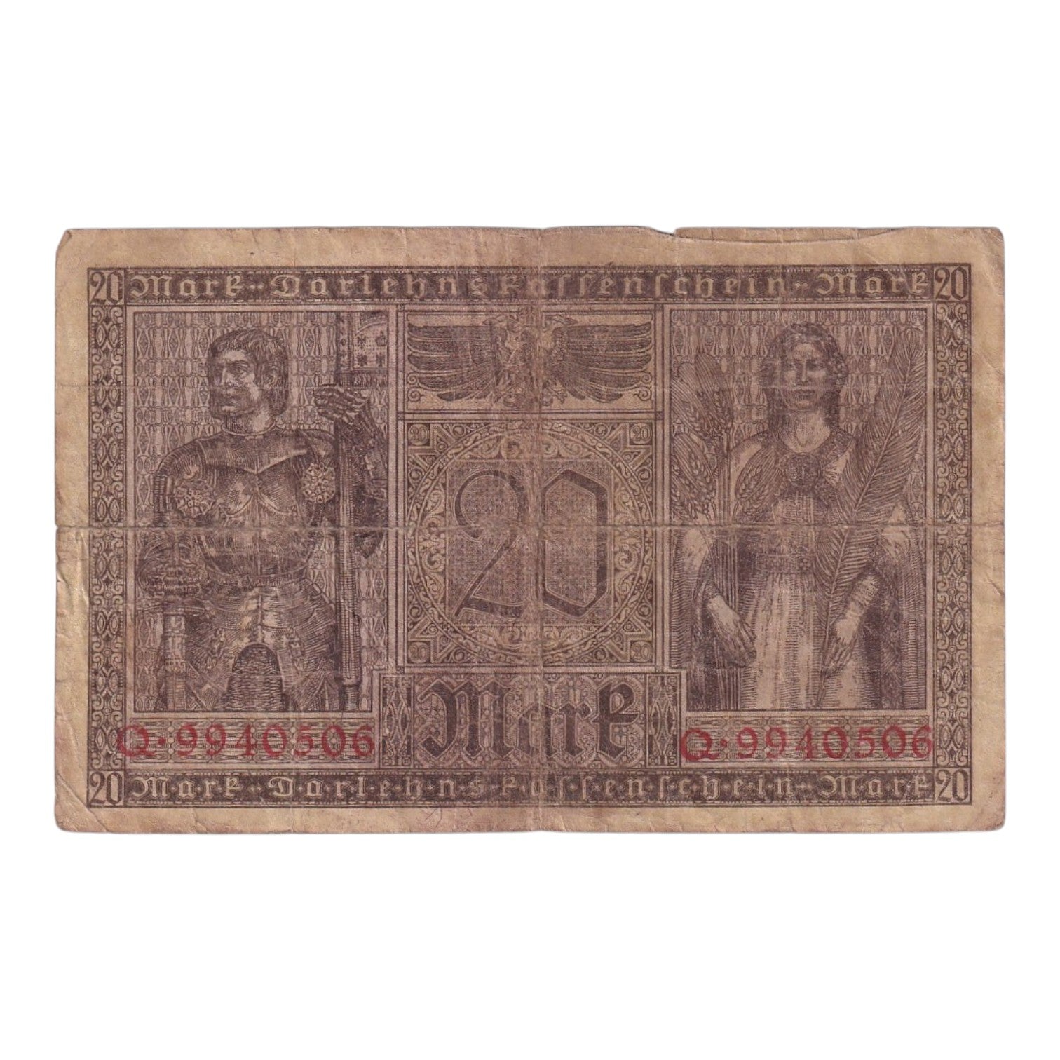 This 1918 German 20 Mark banknote is a fascinating piece of currency from the final years of the First World War, reflecting the artistic style of the era.