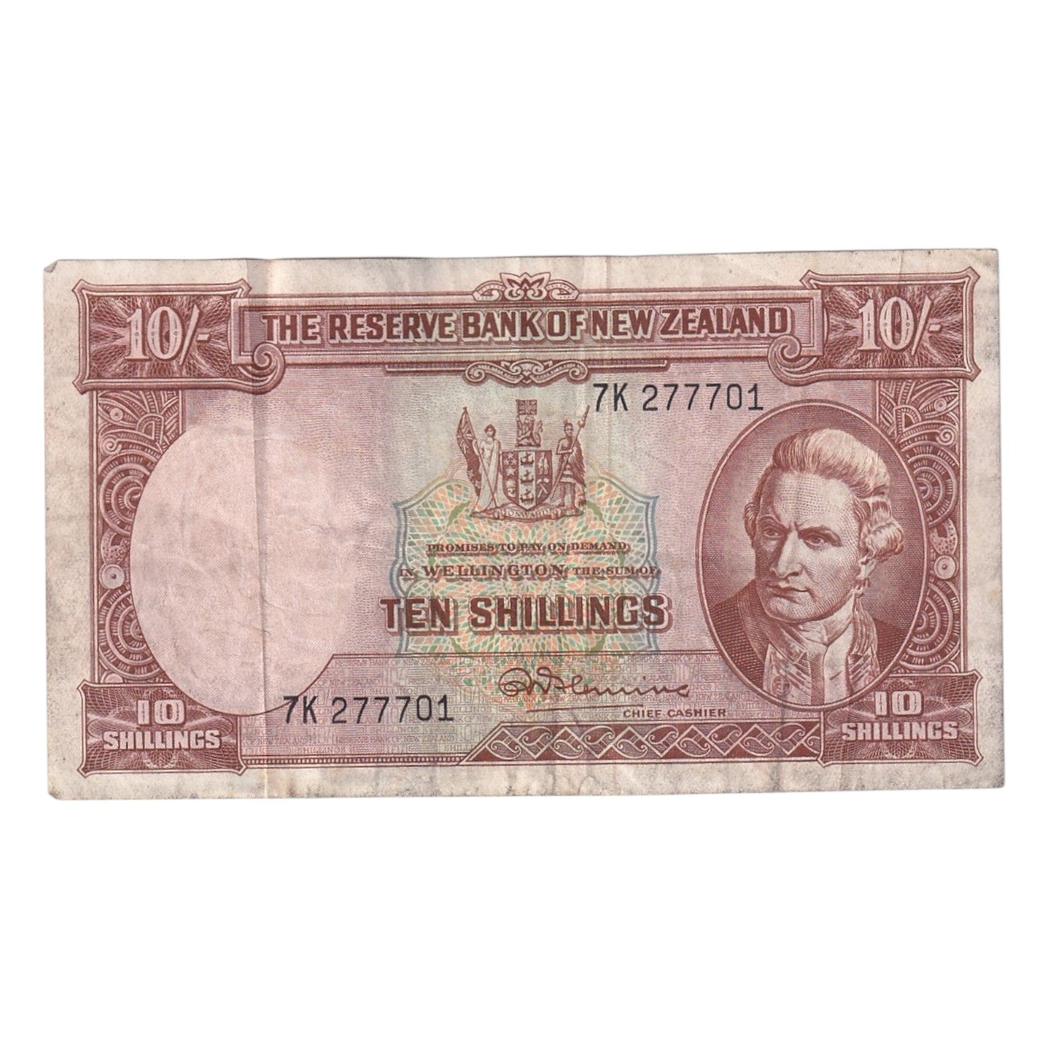 This well-preserved 1967 New Zealand ten shillings banknote is a historical artifact from the pre-decimal currency era. The brown design is set against a multicolored underprint, creating a visually striking note that tells a story of the nation's history.