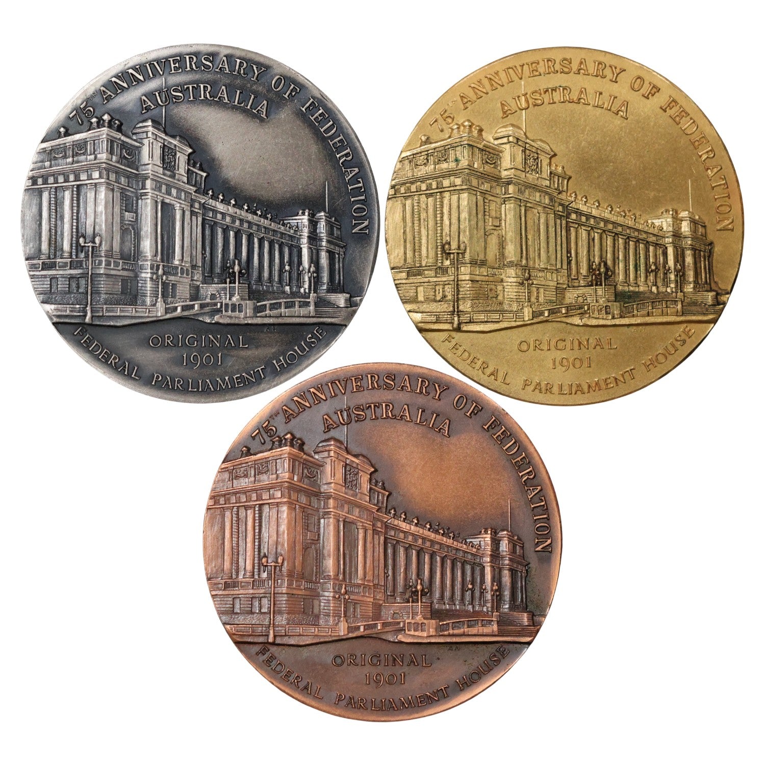 Celebrate a significant milestone in Australia's history with this complete set of three commemorative medals, issued by the ANZ Numismatic Society in 1976 to mark the 75th Anniversary of Australian Federation (1901–1976). This historic collection features three distinct metal compositions, each struck to honour the anniversary.