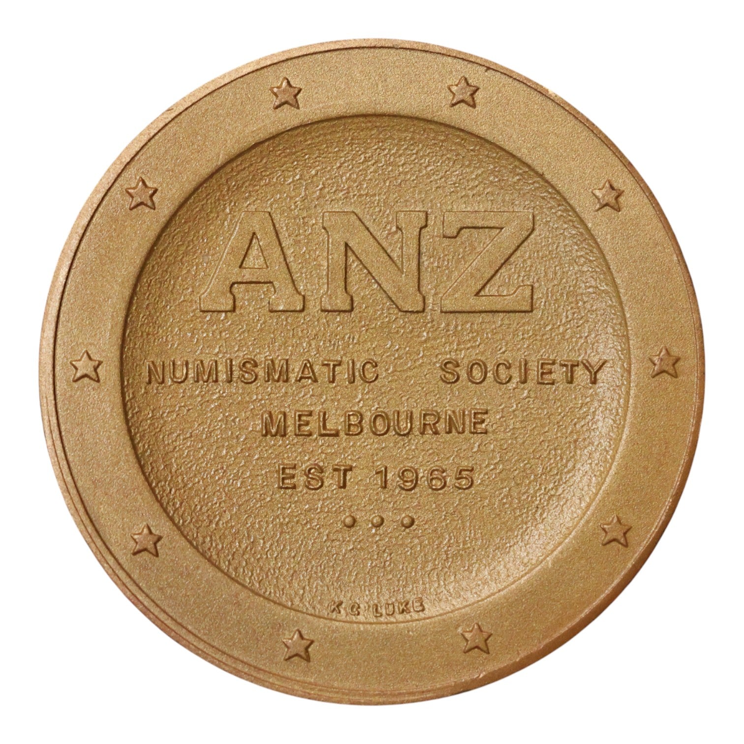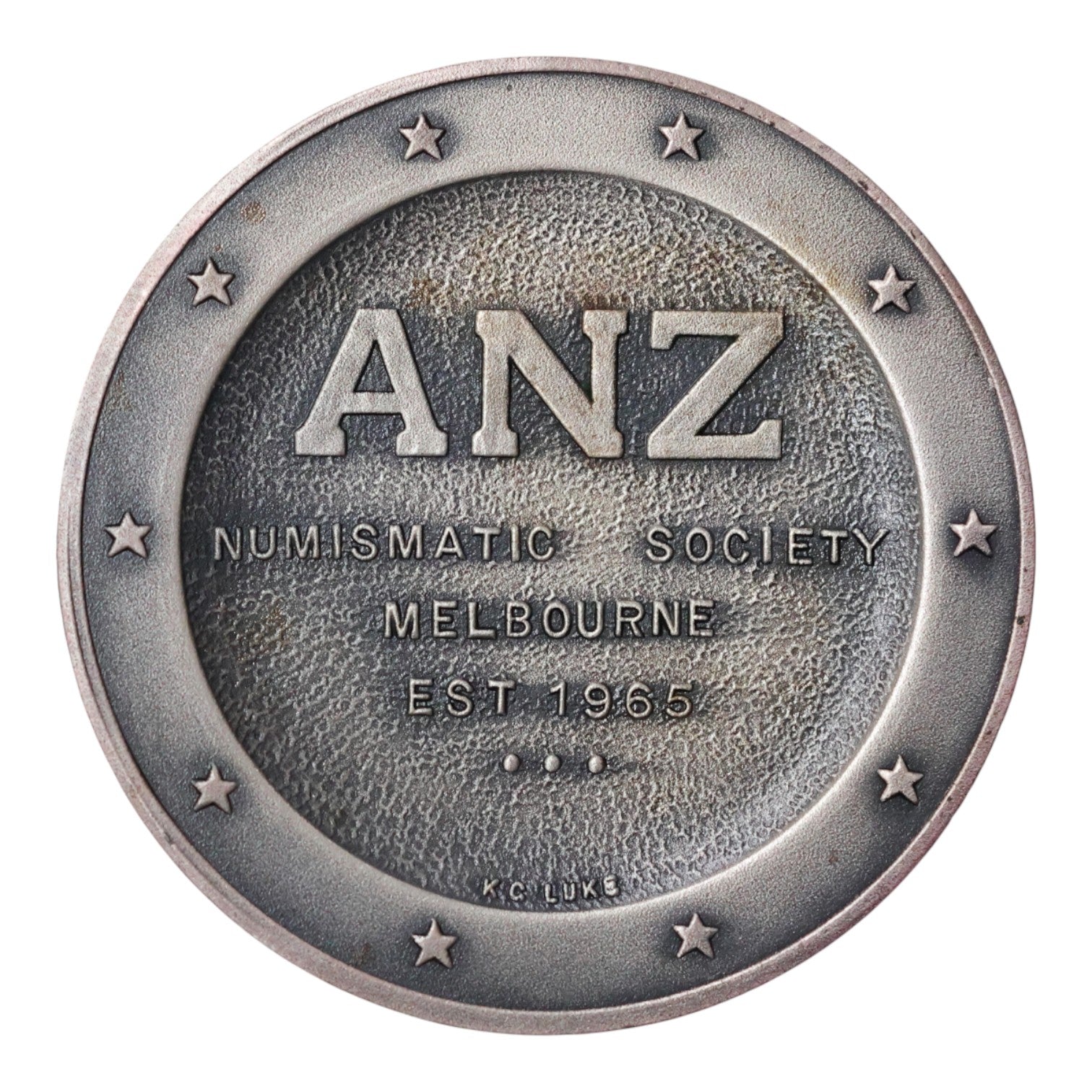 - The Reverse features the society's details within a broad rim decorated with stars, inscribed with: 'ANZ / NUMISMATIC SOCIETY / MELBOURNE / EST. 1965'.