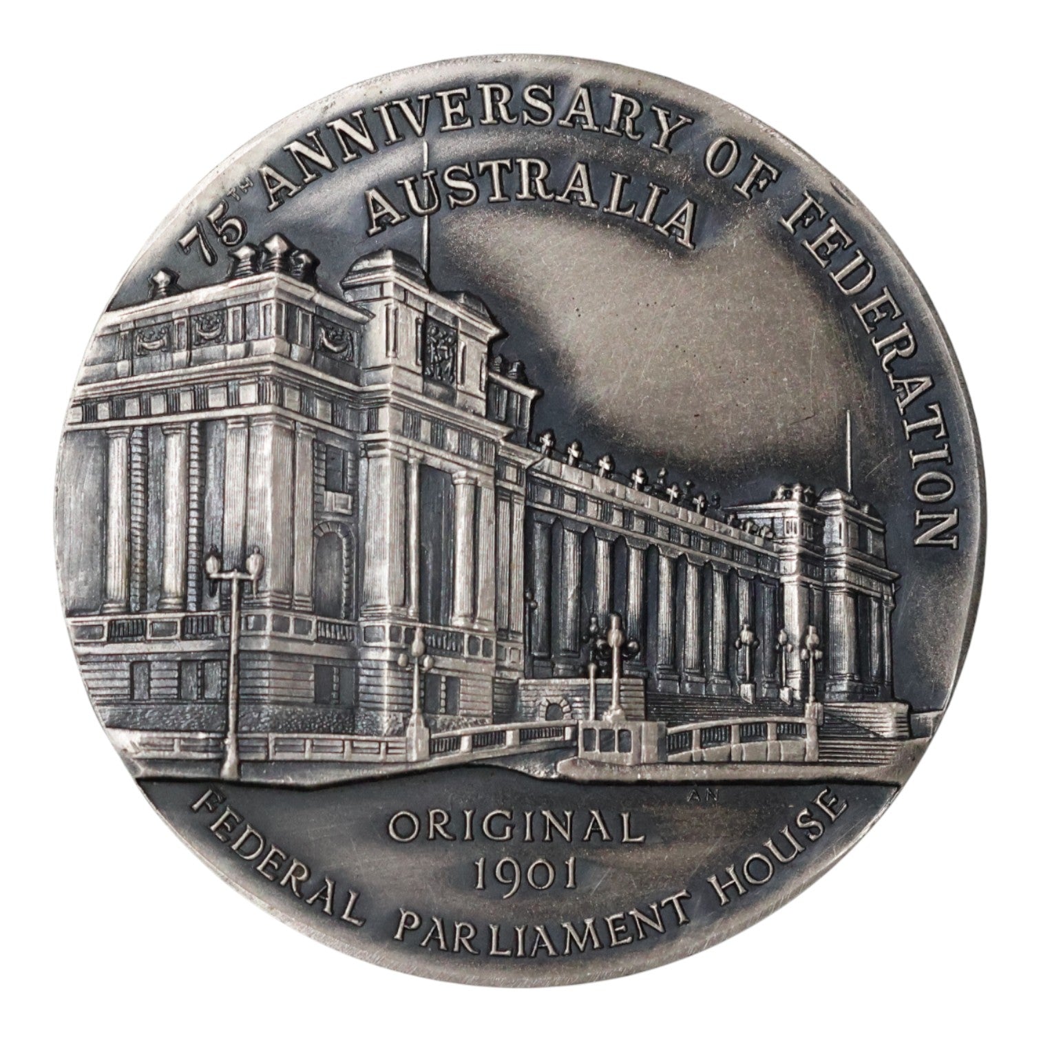 - The Obverse features a view of Parliament House, Victoria, which served as the original seat of the Federal Parliament in 1901. The inscription reads: '75TH. ANNIVERSARY OF FEDERATION / AUSTRALIA' and 'ORIGINAL / 1901 / FEDERAL PARLIAMENT HOUSE'.