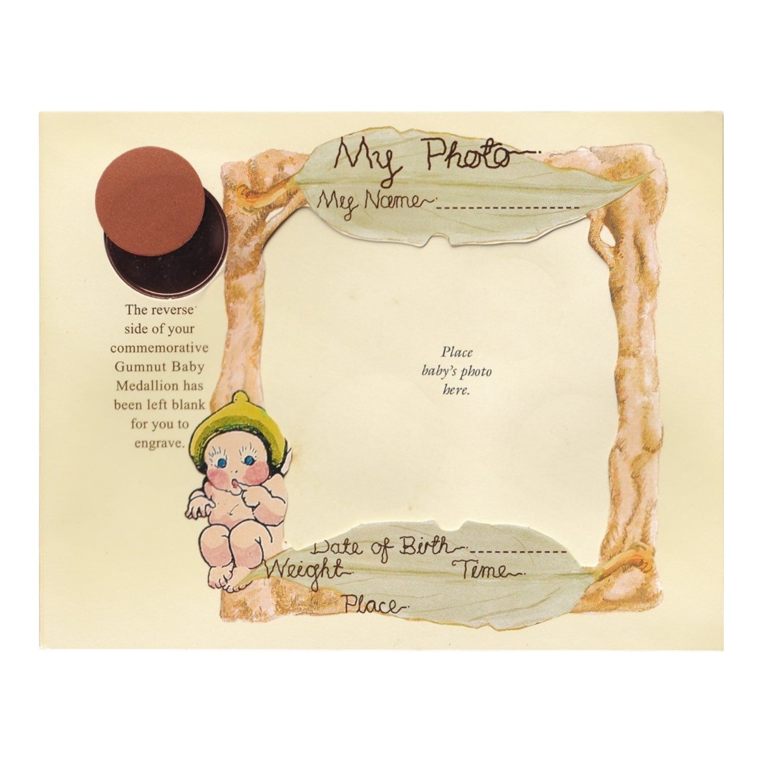 - Packaging: Contains original packaging, which includes a Gumnut baby token, a place for a photo, and a family tree.
