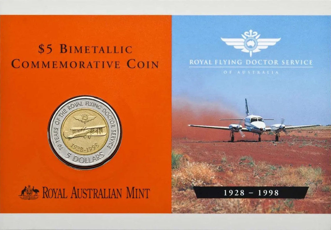 - Reverse Design: Displays the RFDS logo above an early bi-plane, with the inscription '70 YEARS OF THE ROYAL FLYING DOCTOR SERVICE 1928-1998 5 DOLLARS'.