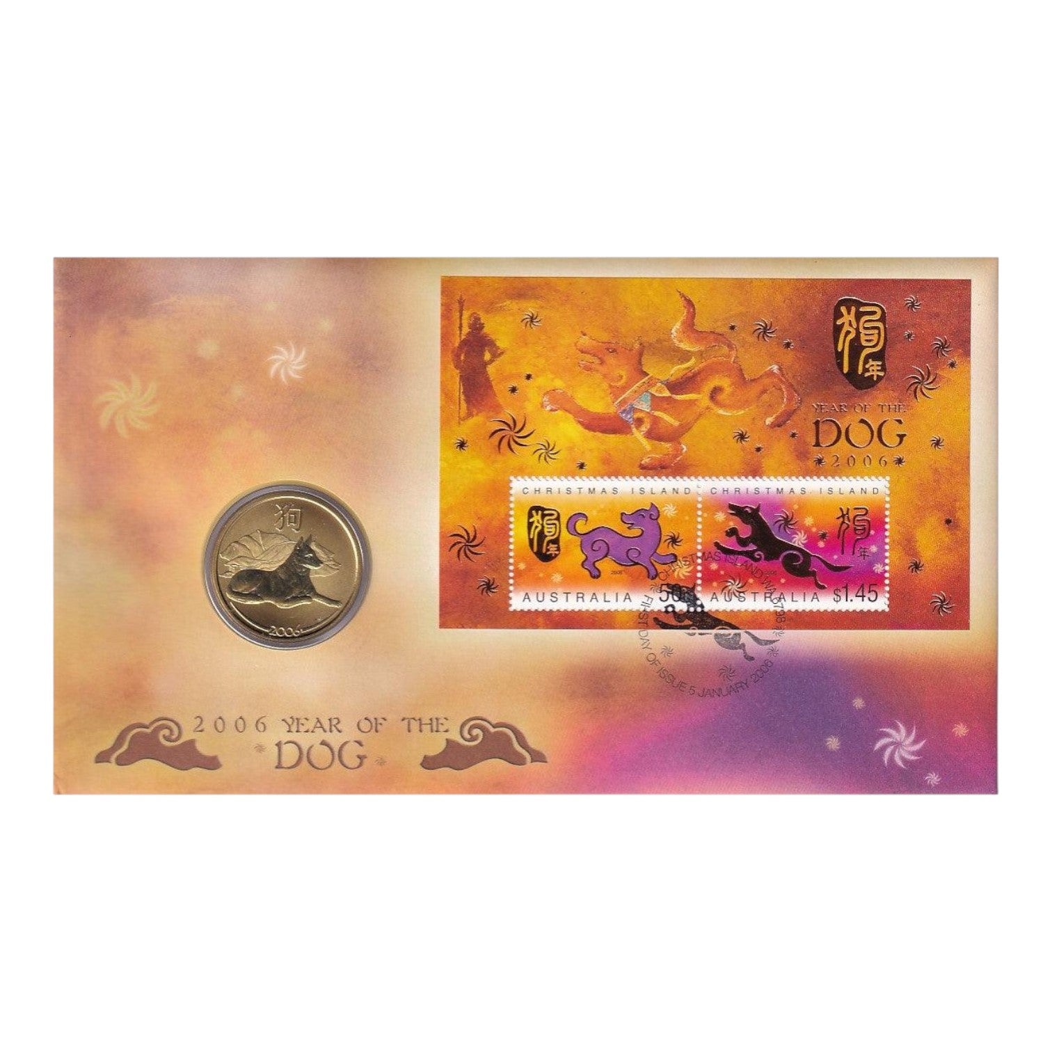 - Commemorative Stamps: Includes two cancelled stamps ($1.45 and 50c) with vibrant Year of the Dog illustrations.
