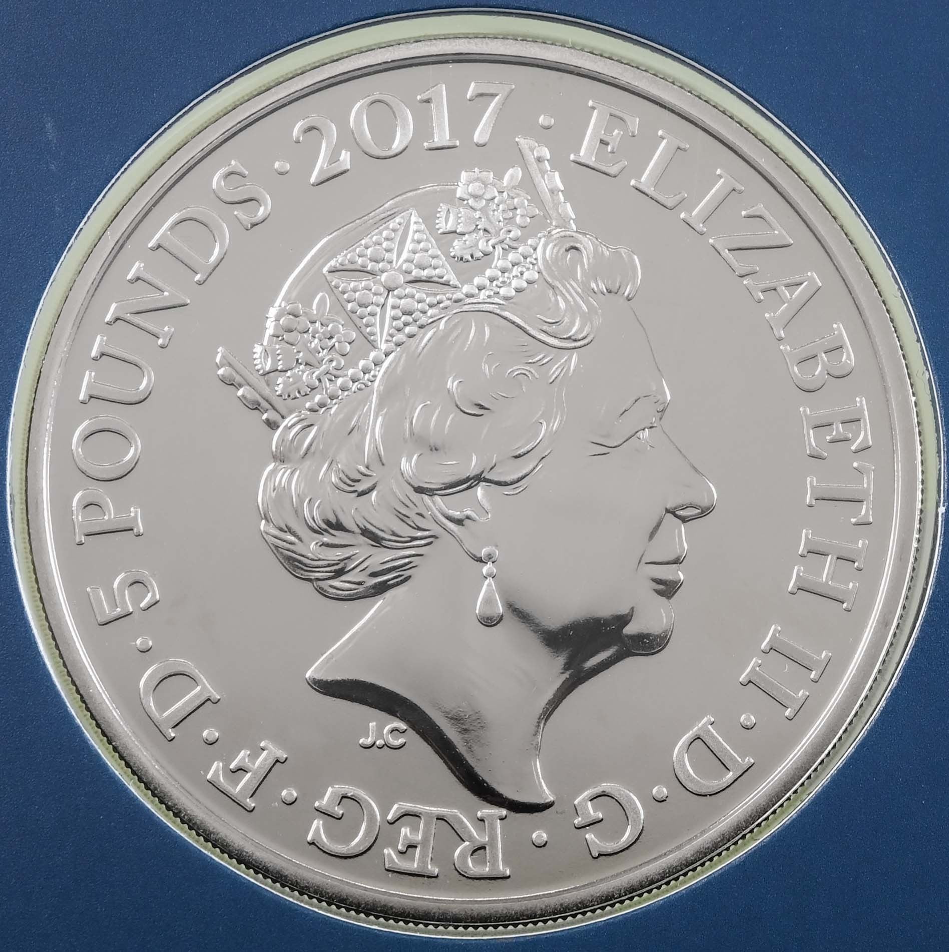 The coin is a £5 Crown (UK Legal Tender) with a Brilliant Uncirculated (BU) finish, struck twice during production for a superior collector quality. It is composed of cupro-nickel, weighs 28.28 grams, and has a diameter of 38.61 millimetres. You will receive your limited edition pre-owned coin complete in the original Royal Mint slipcase, which has been specifically designed for this Brilliant Uncirculated version.