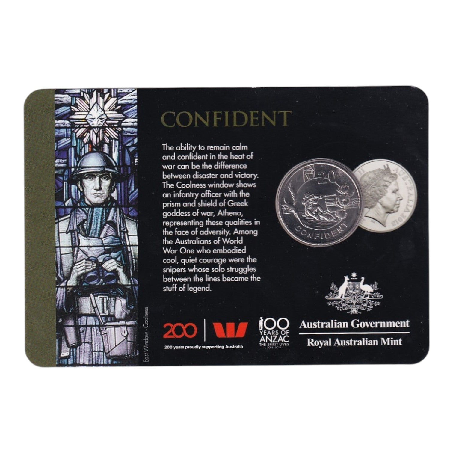 This 2018 Australian Twenty Cent Coin is part of the commemorative ANZAC Spirit Series, celebrating the value of Confidence—the self-assurance, determination, and skill displayed by Australian soldiers in combat.
