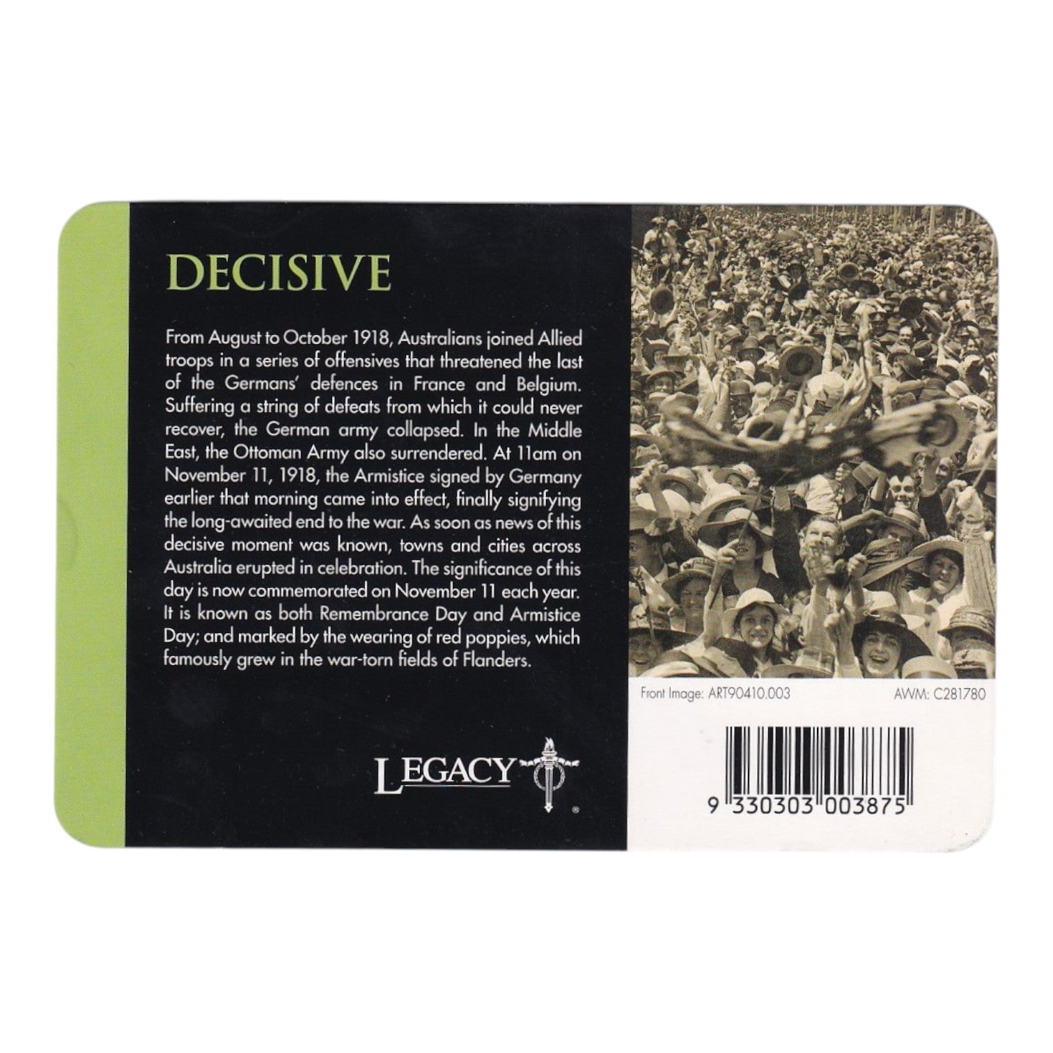This 2018 Australian Twenty Cent Coin is the climactic release in the commemorative ANZAC Spirit Series, celebrating the value of Decisive—commemorating the moment the war ended and the sense of national victory and relief.