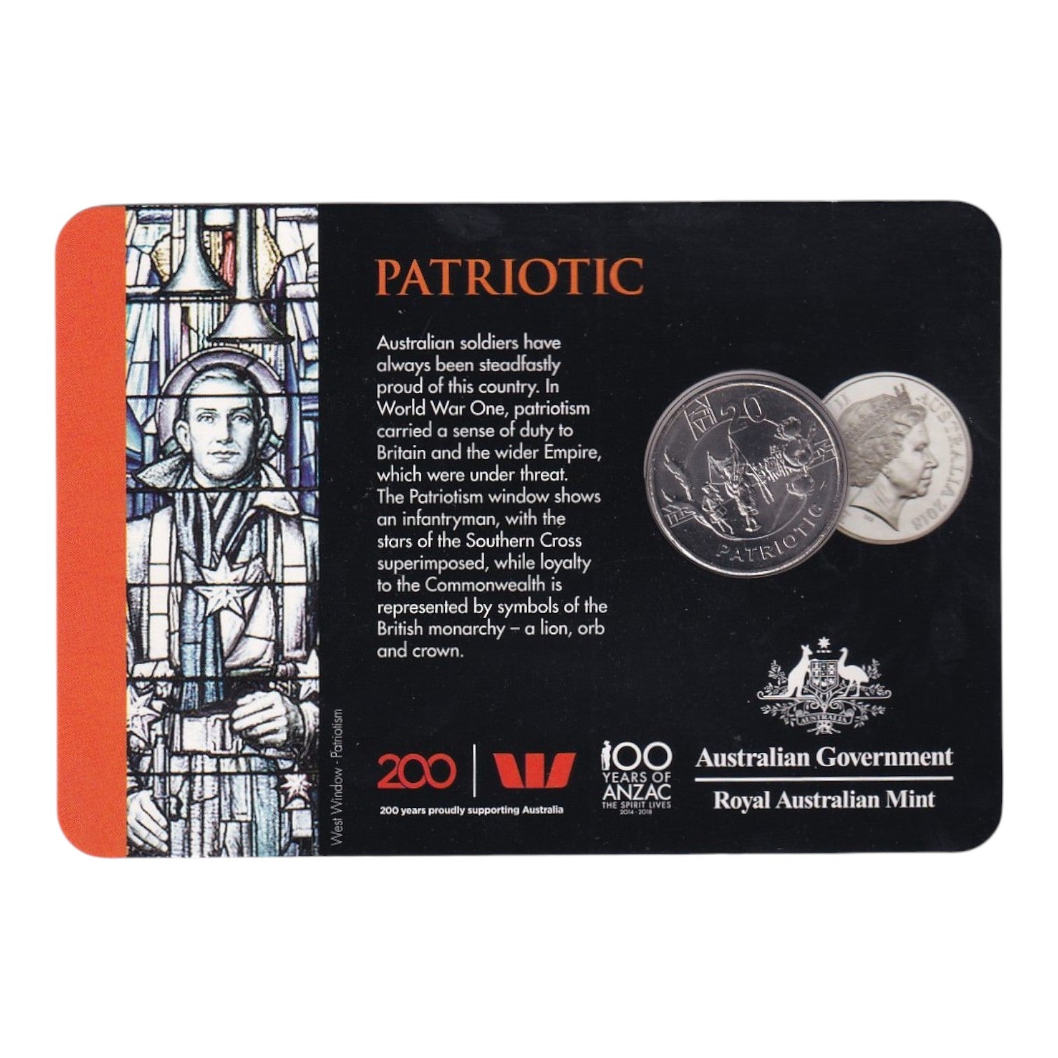 This 2018 Australian Twenty Cent Coin is part of the commemorative ANZAC Spirit Series, celebrating the deeply felt value of Patriotism that inspired thousands of Australians to volunteer for service during World War I.