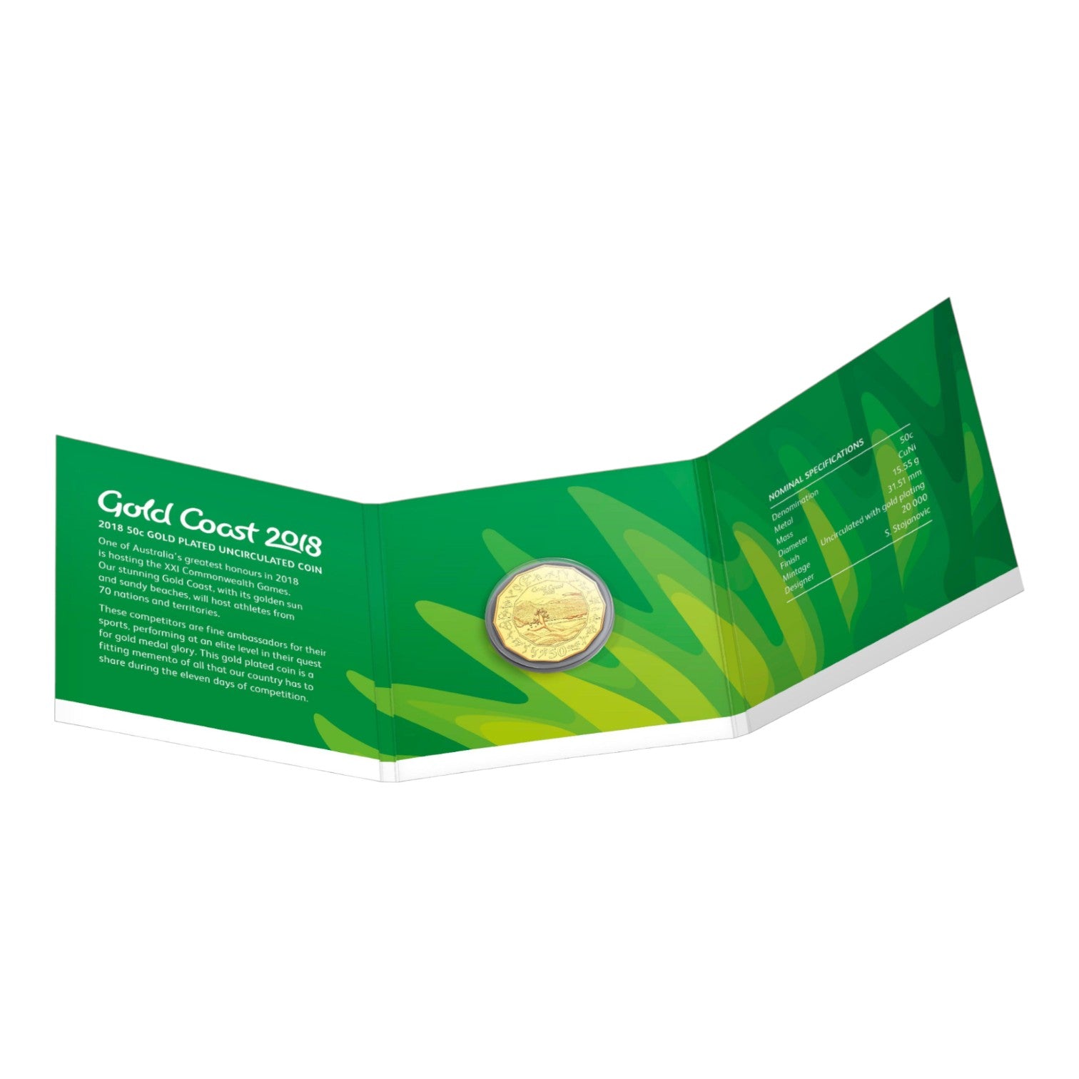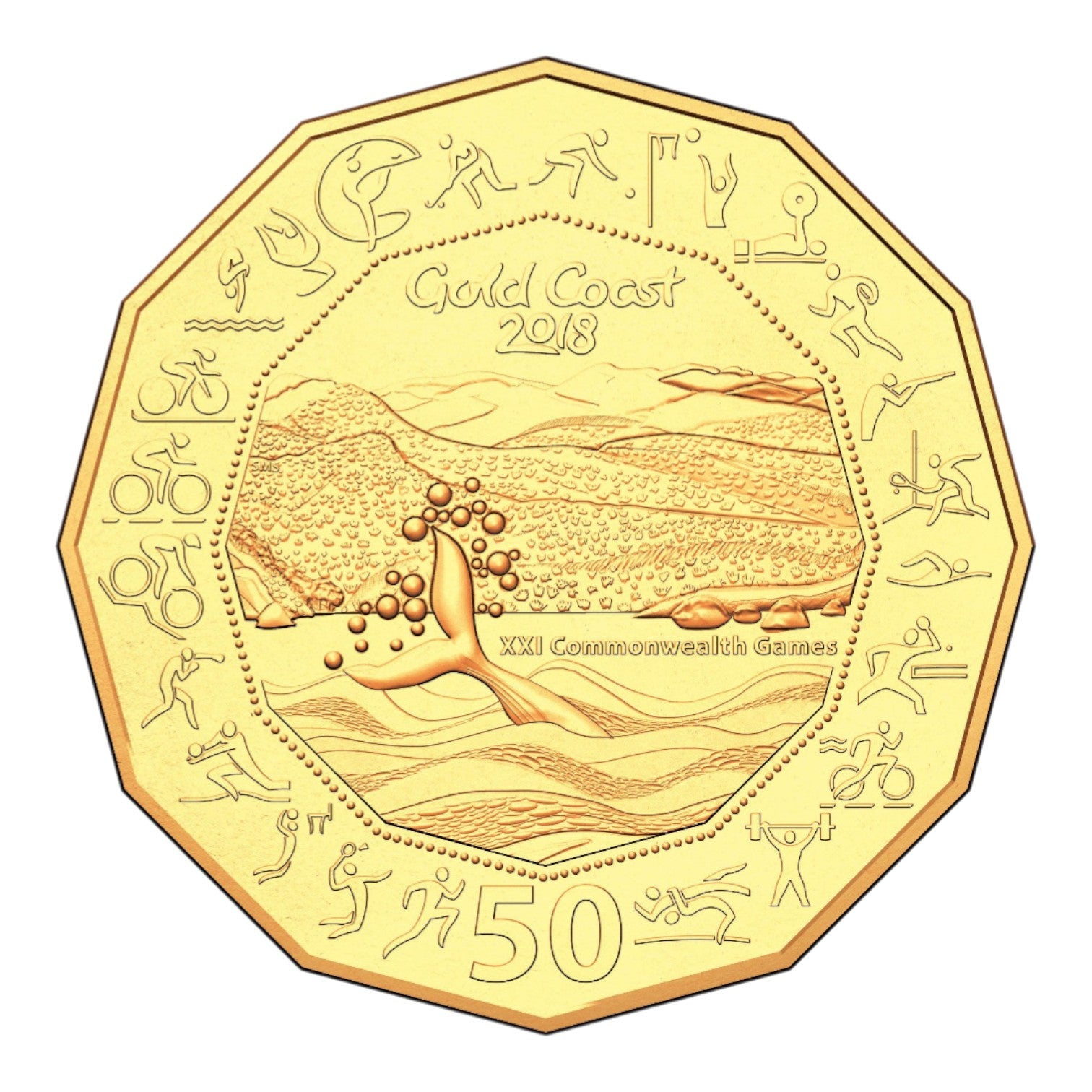 A stunning tribute to Australia's hosting of the XXI Commonwealth Games on the Gold Coast (4-15 April 2018). This gold-plated 50c coin, issued by the Royal Australian Mint, celebrates Australia's unique achievement as the first nation to host the Games five times.