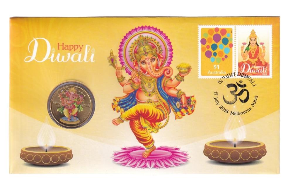 - Festive Stamps: Includes two $1.00 Australia Post stamps (Goddess Lakshmi and colourful balloons).