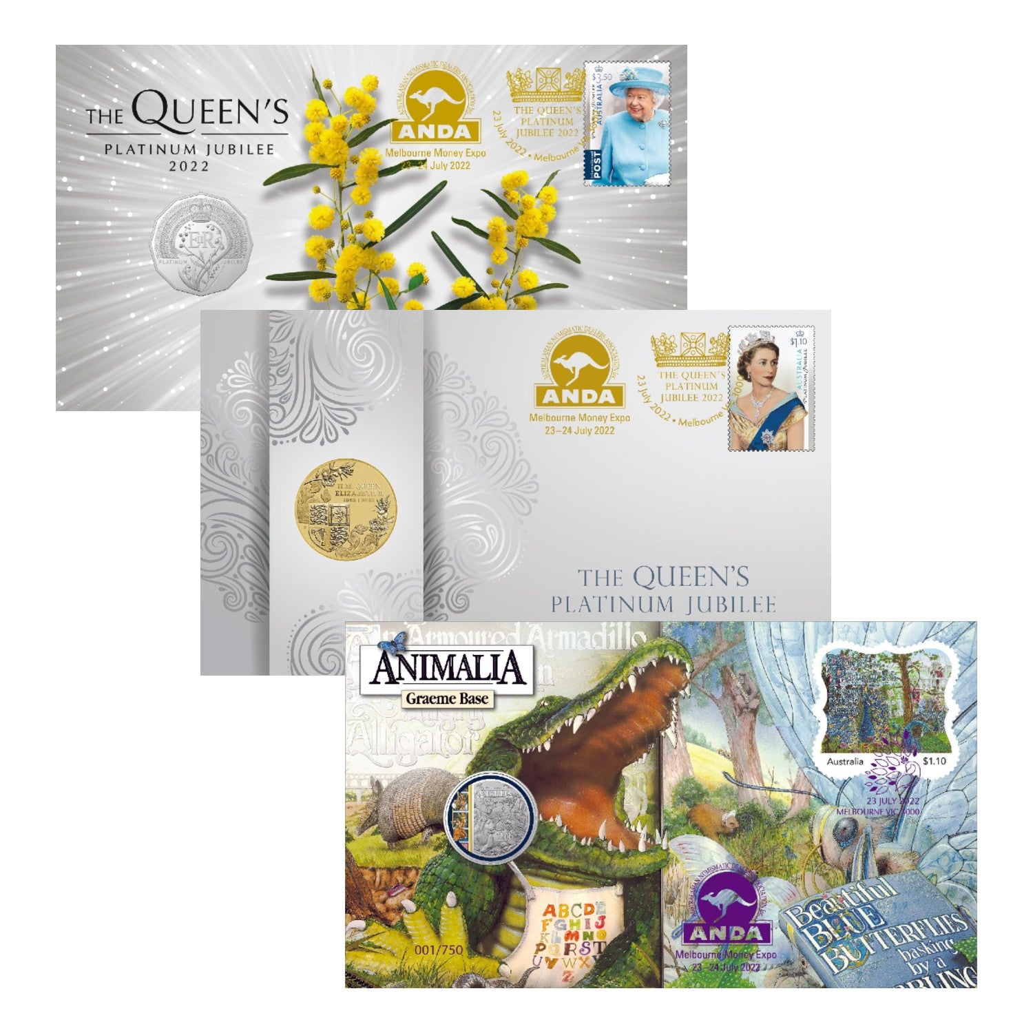 This is a scarce collector's item: a complete set of three 2022 ANDA Melbourne Money Expo Exclusive Postal Numismatic Covers (PNCs), featuring the unique ANDA Overprint and guaranteed matching serial numbers across all three covers.