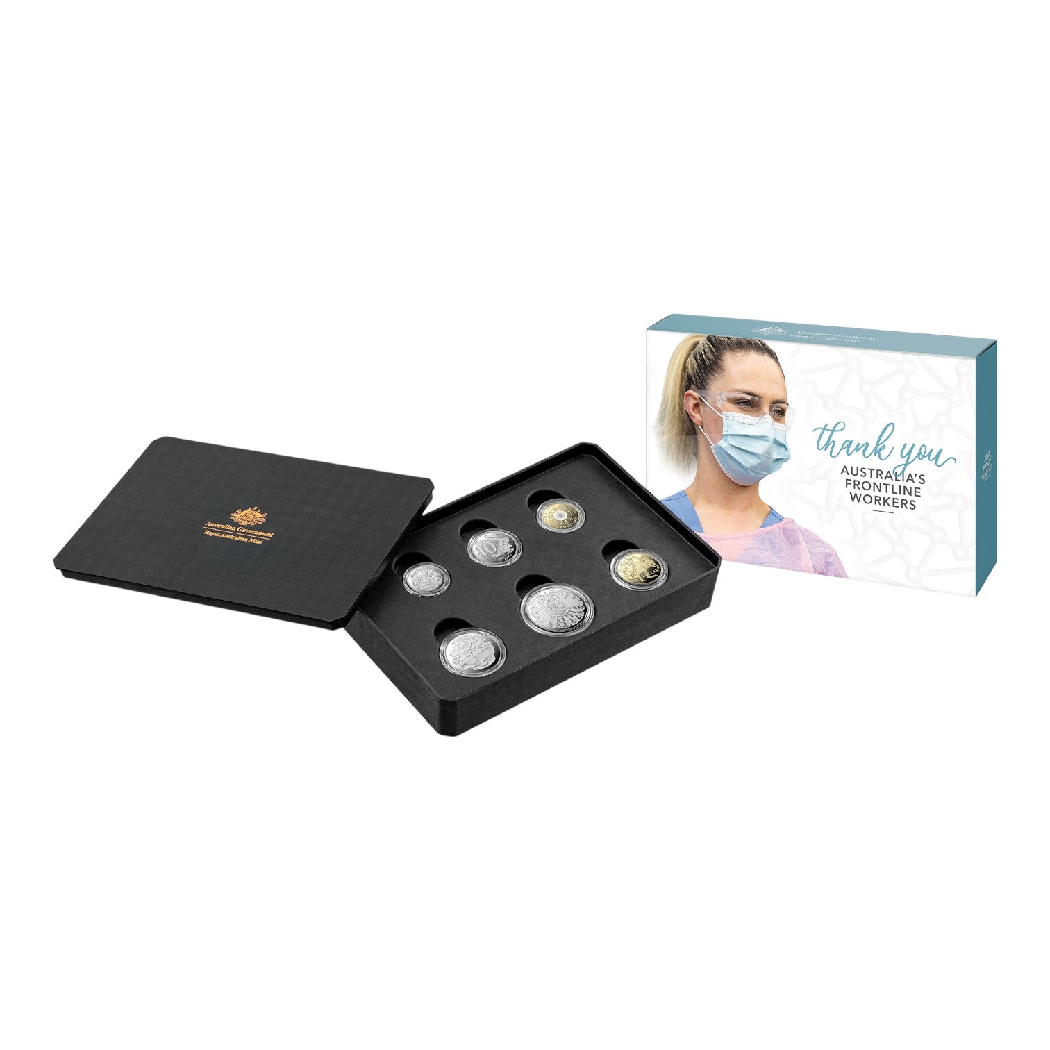 - Special Coin: The set features a specially designed coloured Two Dollar coin. The design includes twelve pictograms representing various frontline professions, encircling a connected pattern that symbolises all Australians they protected.