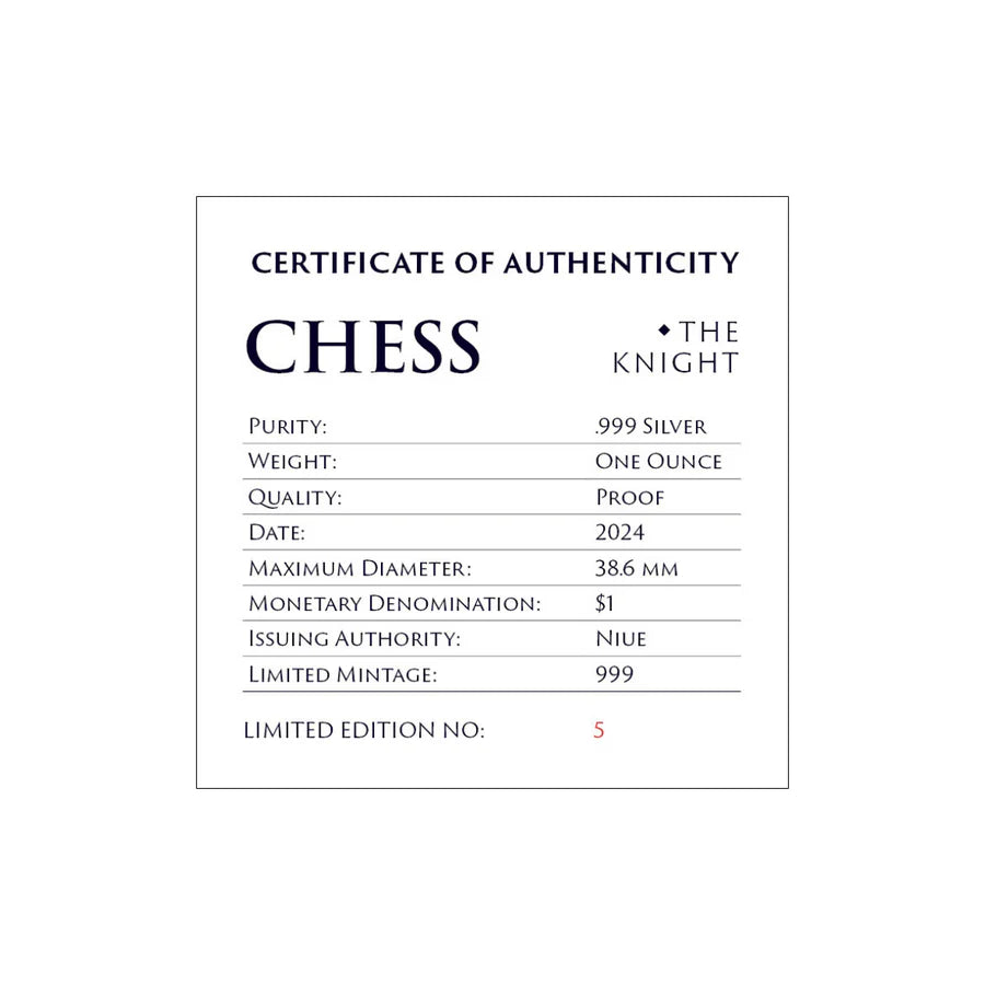 Crafted with meticulous detail, the 2024 Chess Knight coin is a striking tribute to one of the most iconic pieces on the chessboard. Struck from 1oz of 99.9% pure silver in Proof quality, this coin features a magnificent black proof finish that adds a sense of power and sophistication.