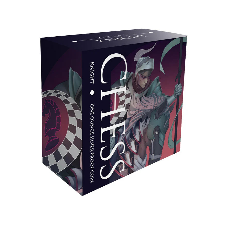 The reverse design depicts the knight, a symbol of courage and tactical brilliance, mounted on his steed and wielding a shield ingeniously incorporating the chessboard itself. This intricate design is brought to life by the contrasting black proof finish, creating a truly captivating piece.