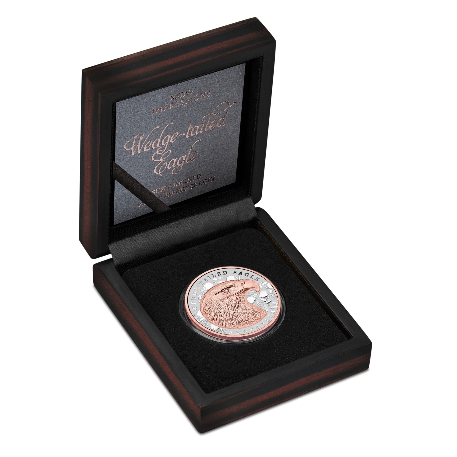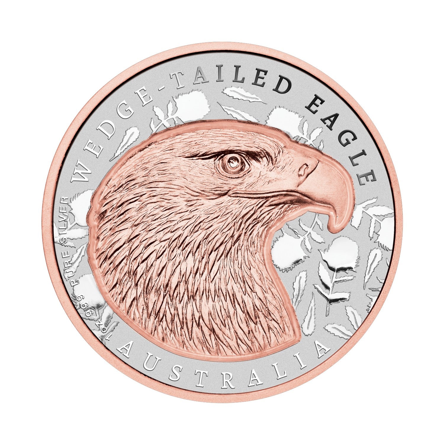The contrast of 99.9% pure silver against selectively applied rose gold plating highlights the majestic Wedge-Tailed Eagle—Australia’s largest bird of prey—in breathtaking detail.