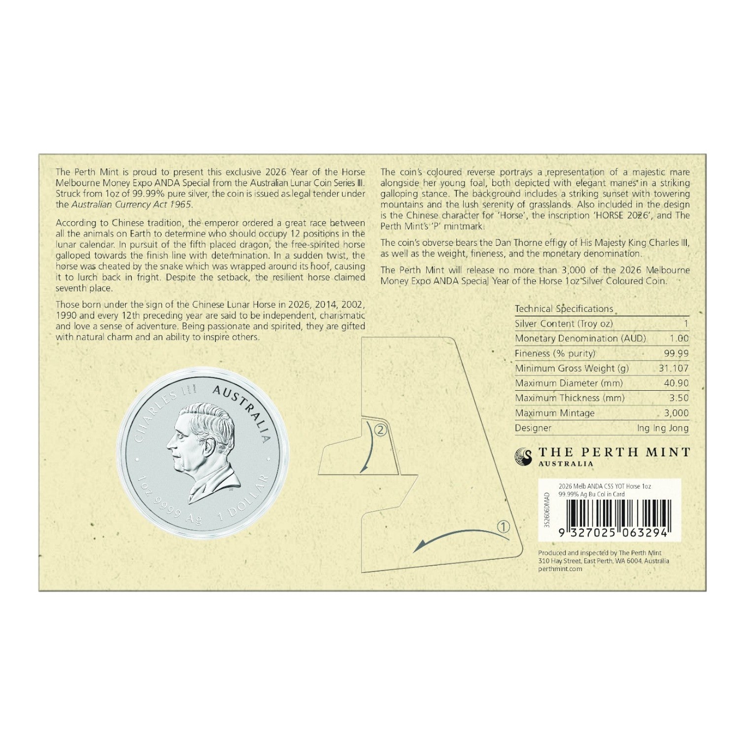 - The Centrepiece: A $1 legal tender coin struck from 99.99% pure silver, featuring a vibrant coloured mare and foal.