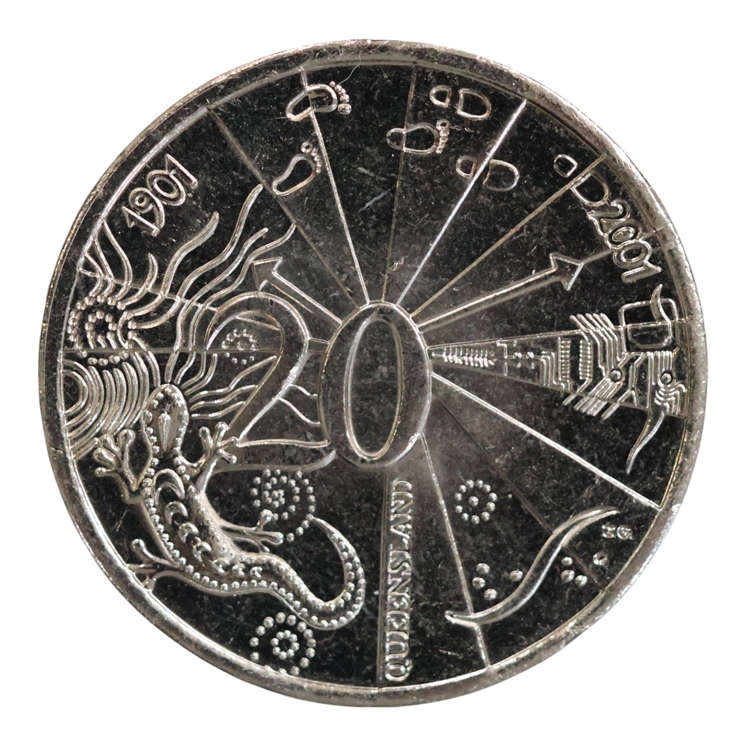 This 2001 Australian 20-cent coin is a unique collectable, struck to celebrate the Centenary of Federation and honouring the state of Queensland.
