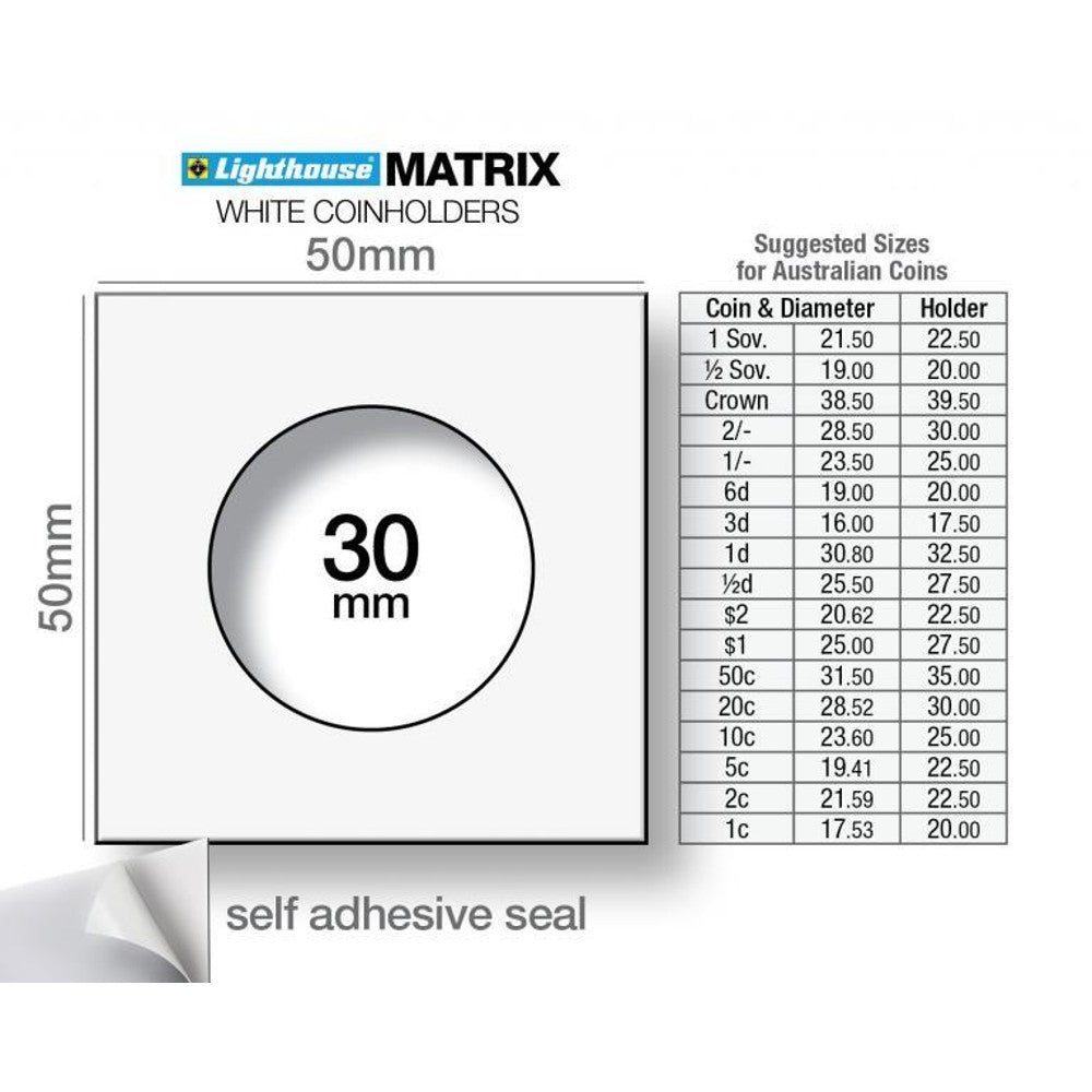 Lighthouse MATRIX WHITE Self-Adhesive Coin Holders - 20 Cent Coin and Florin: 30mm